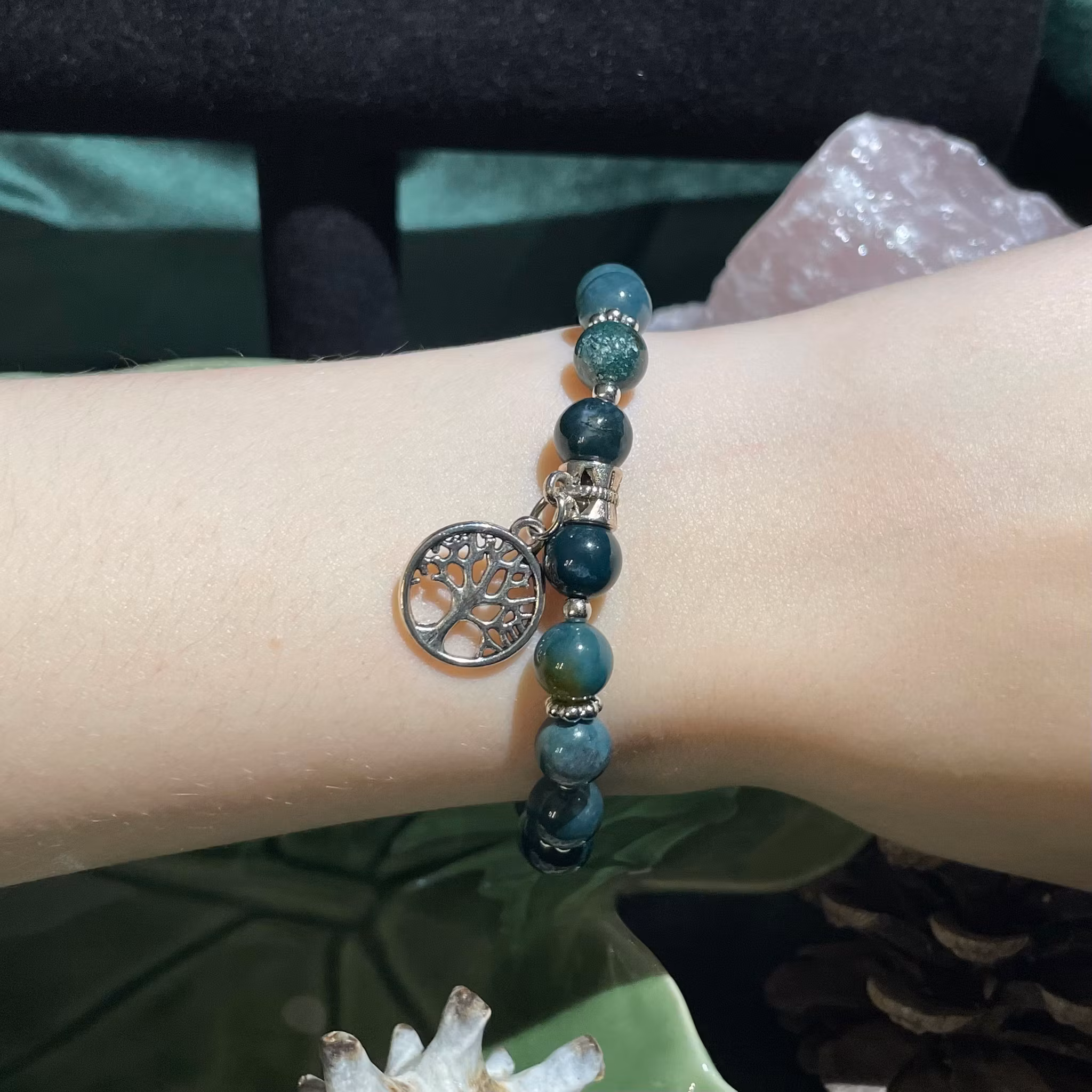 Armband - Mossagat - Rund - Silverpärlor - silver Träd Charm